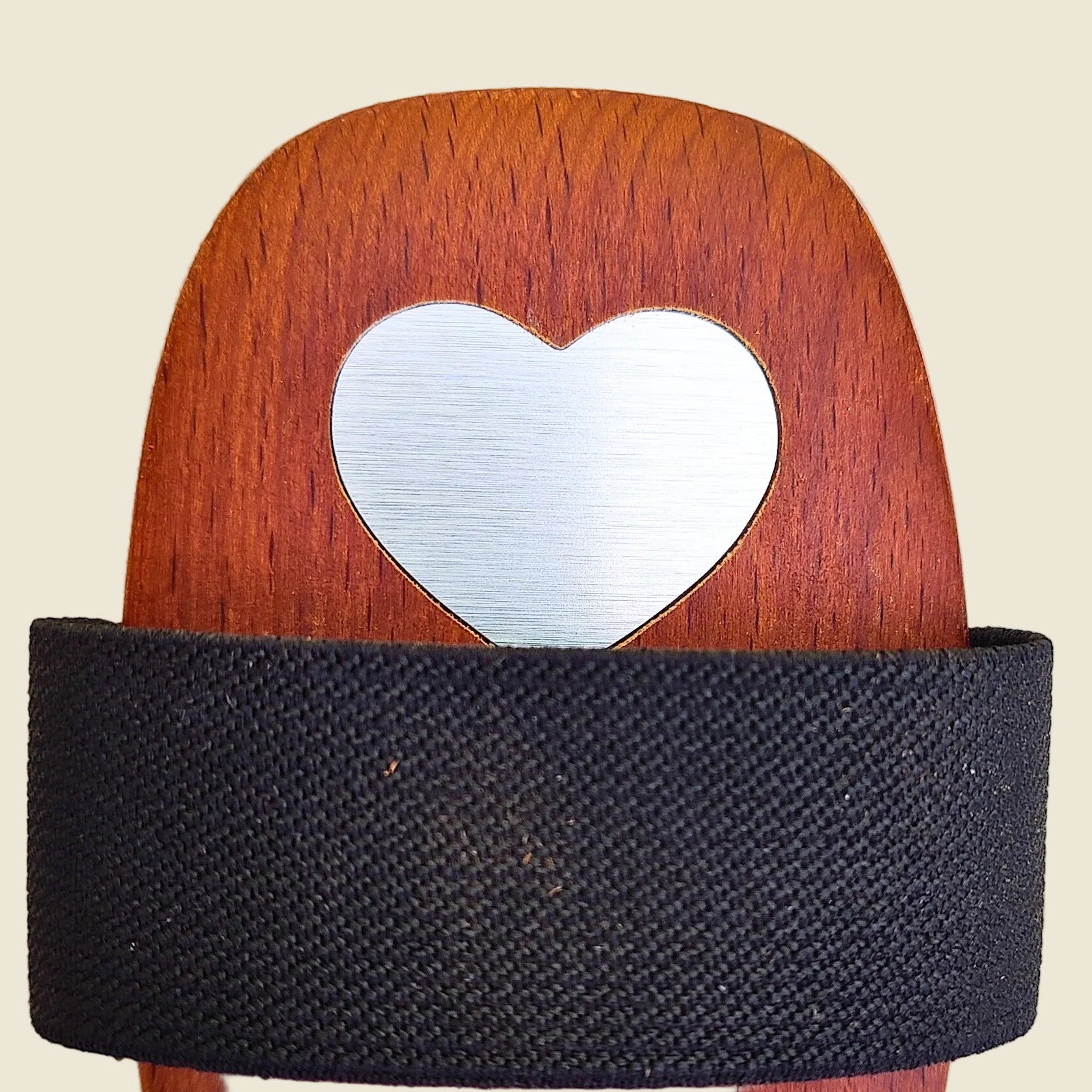 Die Gravurplatte aus Aluminium wird passgenau in den Holzrücken eingelassen und individuell nach Ihren Wünschen graviert. Zur Auswahl stehen eine goldene oder silberne Herz-Gravurplatte sowie zwei unterschiedliche Schriftarten.